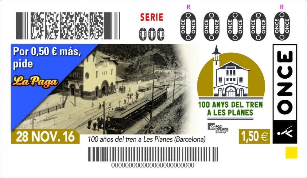 Els 100 anys del tren a Les Planes va protagonitzar el cupó de l'ONCE de dilluns 28 de novembre. Un cupó que portava la llegenda 100 anys del tren a Les Planes i una imatge de l’estació de Ferrocarrils de la Generalitat de Catalunya. També es va fer el bateig d’un tren amb el nom de Lluís Bruguera, ferroviari que dedicà tota la seva vida laboral a millorar el transport ferroviari de l’Àrea Metropolitana de Barcelona.