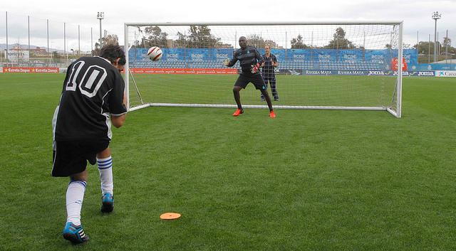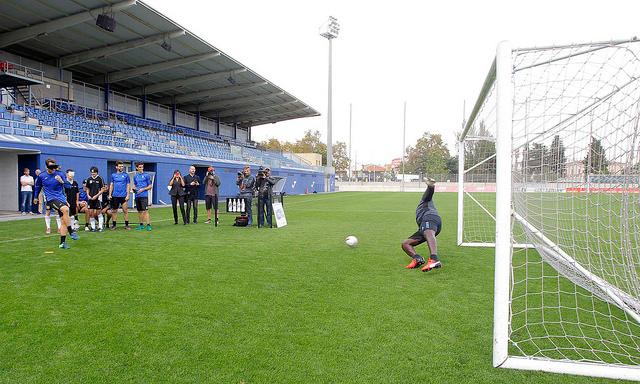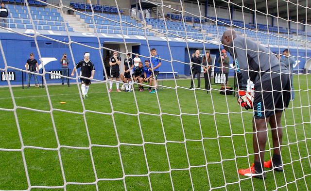 Víctor Sánchez, Víctor Álvarez, Gerard Moreno i Javi López, jugadors del primer equip han fet una ronda de llançaments de penals amb els ulls tapats amb un antifaç i una pilota de picarols. Ho han fet també tres futbolistes afiliats a l’ONCE, Guille Fernández i Víctor Sánchez -de nom igual que el jugador blanc-i-blau- , tots dos cecs totals, i Omar Font, amb discapacitat visual, jugador que ha fet els dos gols. Sota pals, l’exporter perico Tommy N’Kono. També hi ha participat en Raul Tamudo.